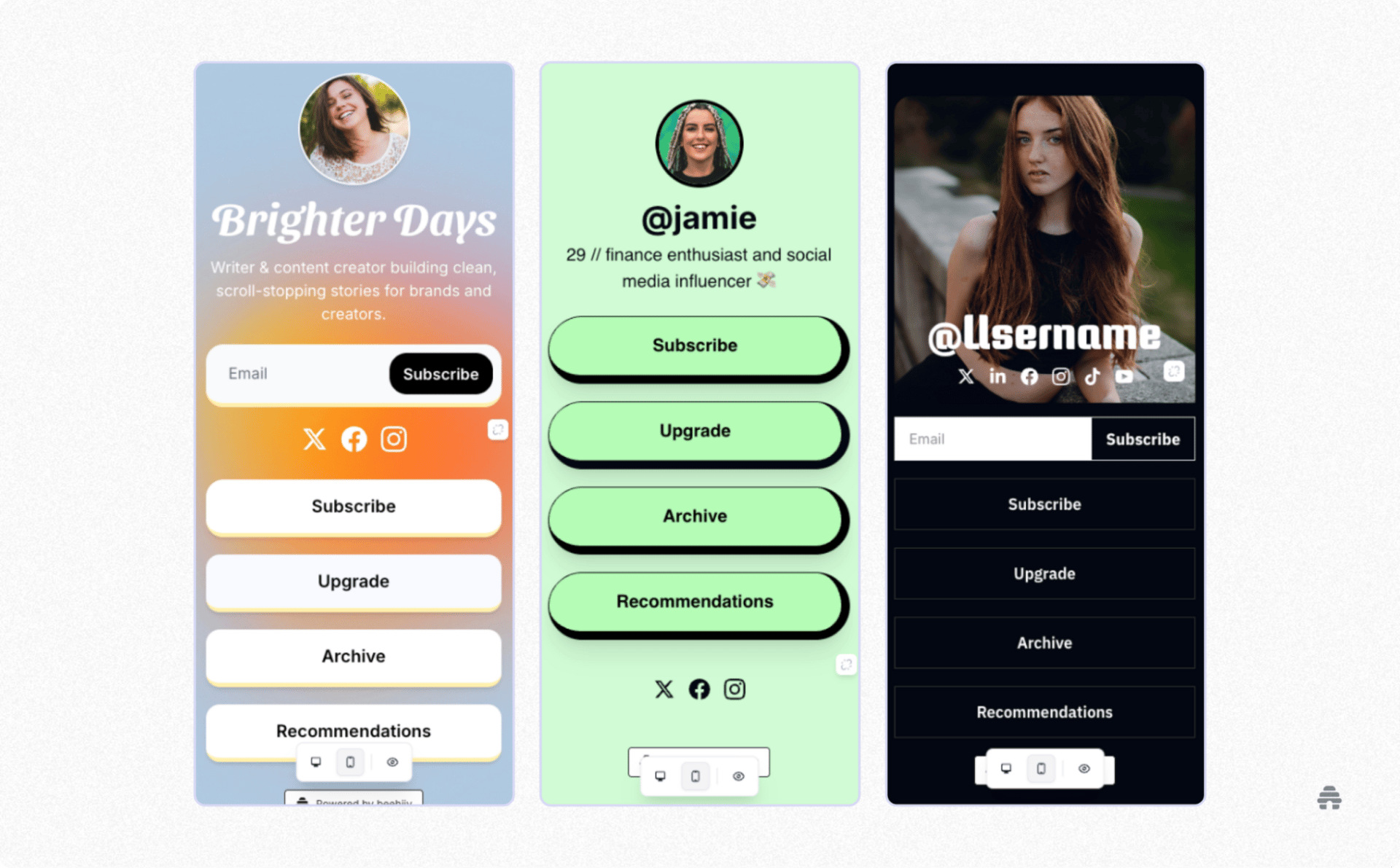 With beehiiv Link in Bio, connect your newsletter, site, podcast, and products in one mobile-first hub.